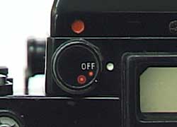 Der Hauptschalter links neben dem Sucherokular regelt die Spannungsversorgung: